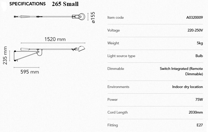Wall lamp providing direct light. Painted steel adjustable arm and reflector. Chrome-plated brass reflector support. Cast iron tapered counterweight. Painted steel wall fixture.