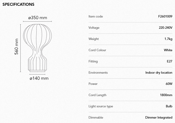Table lamp providing diffused light. White powder coated internal steel structure sprayed with a unique "cocoon" resin to create the diffuser which is then protected by a transparent sprayed on finish. On the cable there is the electronic dimmer which allows the regulation of light brightness.