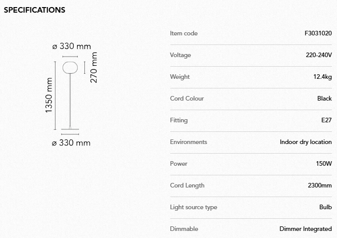 Floor lamp providing diffused light. Diffuser consisting of an externally acid-etched, hand blown, flashed opaline glass and a die-cast threaded ring nut with alodine plating finish. Gray or black painted high-thickness steel base and stem and die-cast aluminum diffuser support. On the cable there is the electronic dimmer which allows the regulation of light brightness.