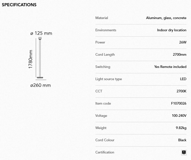 Floor lamp with indirect light. Stem in painted aluminium: shiny white, brick, cioko, green. Reflector in shiny opal white and grey blown glass. Electrical cable of 270 cm usable length with foot dimmer switch for ON/OFF function and brightness adjustment 10-100%. Power supply with interchangeable plugs.