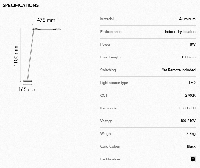 Floor lamp. Head in pressofused aluminium, diffuser in PC. Power pack on plug, base cover in injection printed PC, counterweight in iron cut and painted by means of a cataphoresic process. Directionable head. Three-step ON/OFF switch with Soft Touch technology. Base separated from the lamp body with safety locking pin.