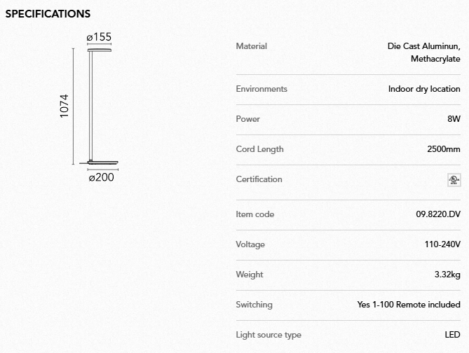 Floor lamp that, thanks to its innovative patented lens, offers asymmetrical light distribution and excellent visual comfort. Its shape, height and dimensions are consistent with the functionality of the product, which provides excellent reading or companion lighting while keeping the light source invisible to the user. Driver input: 24 V