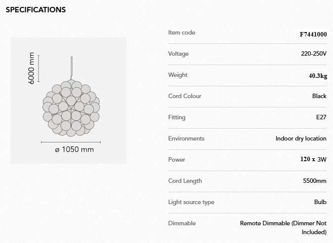 Suspension lamp providing direct and reflected lighting. Structure formed by 20 pressed, polished aluminum triangles. 120 clear Globolux lamps housed around the structure. Steel ceiling fitting and rose.