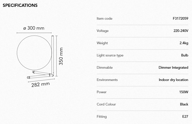 Table lamp providing diffused light. Frame in brass, black or chrome steel. Blown glass opal diffuser. Dimmer on the power chord.