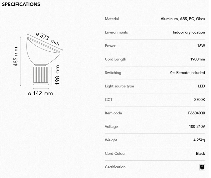 Table lamp providing indirect and reflected light. Reflector in painted aluminium, gloss white on the outside and matt white on the inside. Directionable diffuser in transparent blown glass. Body in matt black or naturally anodized extruded aluminium. Base in nickel-plated ABS+PC. Electric cable of useful length 190 cm, with dimmer switch for ON/OFF and adjustment of the light flow between 10-100%. Plug-in power supply with interchangeable plugs.