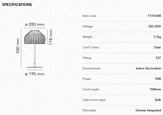 Diffused light table lamp. Exterior diffuser in Polycarbonate. Internal diffuser in injection printed opal polycarbonate. Support and base in painted steel.